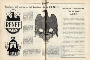 El primer emblema de RENFE fue elegido en un concurso convocado por la revista Ferroviarios. Representa un águila con las alas desplegadas en cuya parte inferior aparecía en anagrama RENFE.