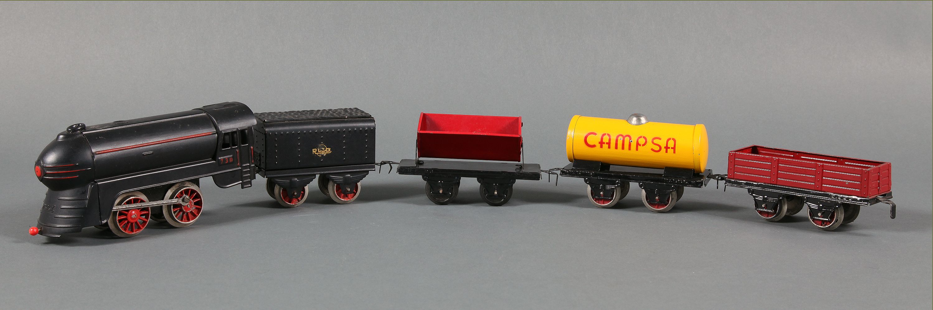 por representación idealizada de locomotoras, coches y vagones, el