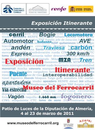 03/08/2011 ¡No te olvides de picar tu billete! La renovada Exposición Itinerante del Museo del Ferrocarril de Madrid viajó a Almería, donde el pasado 4 de marzo fue inaugurada en el Patio de Luces de la Diputación Provincial por su presidente, Juan Carlos Usero, el director del Museo del Ferrocarril, Miguel Muñoz, y el subsecretario de Fomento, Jesús Miranda Hita, con la asistencia de diversas autoridades, miembros del ámbito académico, socios de ASAFAL y público en general. |