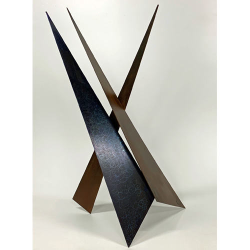“El trabajo que desarrollo se basa en la búsqueda del dialogo entre la Masa y el Vacío, ejecutando composiciones geométricas trabajados en distintos tipos de aceros, corrugados, inoxidable, cortén…. Y dándoles diferentes acabados, pintura, oxido, brillo,… Materiales y acabados que partiendo de la GRAN MASA se descompone y aligeran hasta la abstracción de la línea y el vacío. Así la Materia y el Espacio compiten por la Luz.” (Raquel Fernández Santos)